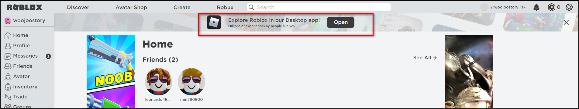 로그인을 하게 되면, 화면 상단에 로블록스를 체험해보라는 문구가 뜨고 여기서 Open 버튼을 클릭합니다.